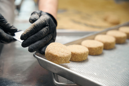 Kitchen employee puts a cutlet in breadcrumbs on metal sheet