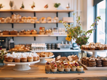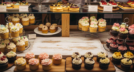 Delicious array of cupcakes and treats displayed in a cozy bakery during the afternoon. Generative AI