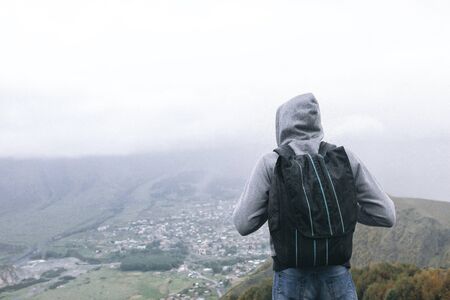 Young tourist man with a backpack against the background of the Caucasus Mountains, Georgia on a foggy day
