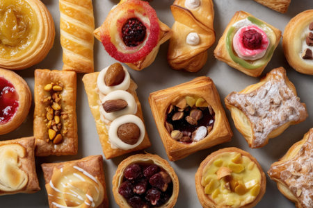 overlapping pastries, with different fillings and toppings, created with generative ai