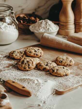 Freshly baked cookies are arranged on a wooden surface, with ingredients and baking tools in the background, creating a warm kitchen vibe.