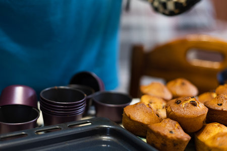 Cupcakes with raisins just from oven, taking off from cupcakes cutters.