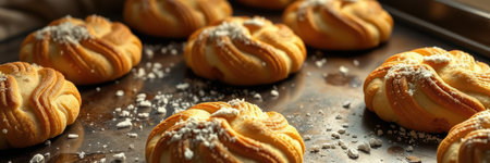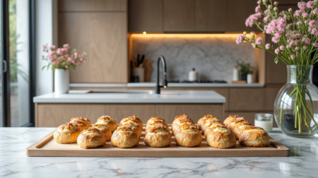 Freshly baked pastries arranged on a baking tray in a cozy kitchen environment