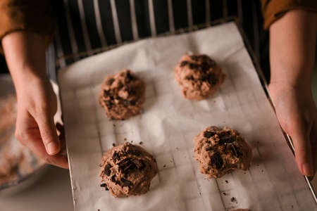 Female holding a tray of chocolate chip cookies dough, preparing to bake in the oven. close-up image
