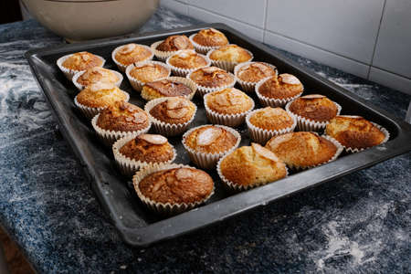 Variety of fresh baked muffins on baking tray, selective focus