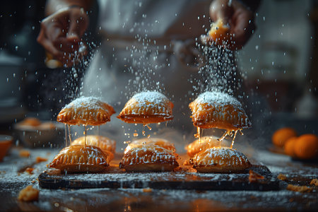 A confectioner sprinkles powdered sugar over a group of freshly baked pastries displayed on a cutting board. the warm glow of the kitchen creates a cozy and inviting atmosphere, with oranges visible in the background, adding a pop of color. Generative AI