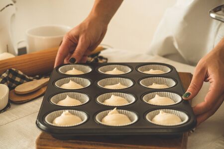 Homemade Pastry. Woman putting with cupcakes muffins to oven in kitchen, unrecognizable female wearing cooking mitten glove enjoying baking at home, cropped image, closeup shot with free space