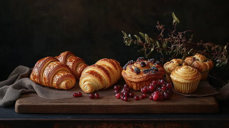 A delightful assortment of freshly baked pastries displayed on a wooden board, accented with seasonal berries, creating a warm and inviting atmosphere.
