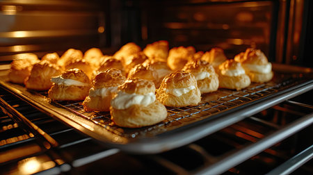A baking sheet of cream puffs expanding in a kitchen oven, their tops turning a golden brown, ready to be filled with luscious cream for a homemade treat