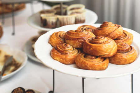 A selective focus closeup of delicious freshly-baked pastries in a cafe