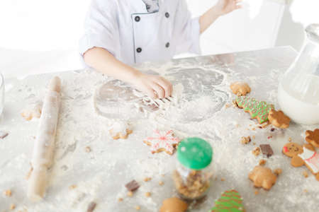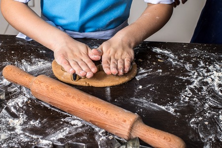 Close up child hands preparing cookies at kitchen
