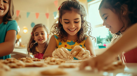 Children joyfully decorate healthy cookies made with oats and dried fruit in a bright kitchen. They are engaged in the fun activity, smiling and sharing happiness with each other.