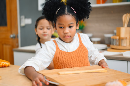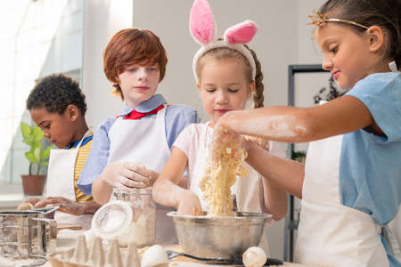 Group of kids are preparing the bakery in the kitchen .Children learning to cooking cookies