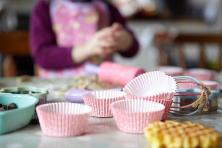 Close up of cupcake wrappers in kitchen