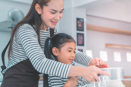 Smiling Asian mother and little asian girl child is baking bakery and mix flour and eggs in bowl together in kitchen. Homemade pastry and mix ingredient for bread. Family love and Homeschool Concept.