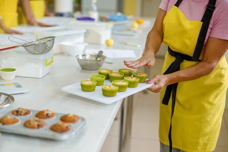 Confectioner took out freshly baked muffins in a baking dish on the table from the oven.
