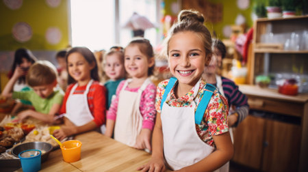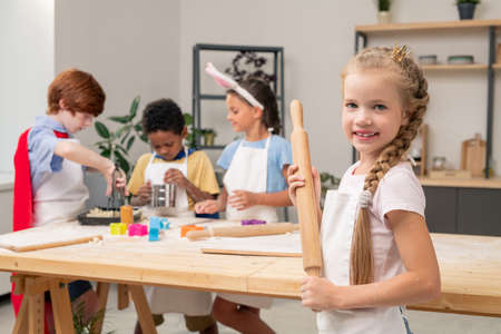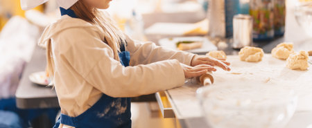 Cooking baking workshop class for school kids. Cute girl playful learning to bake cakes having fun. Kids playing with wheat flour and rolling pin