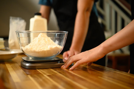 Close up of couple measuring flour for homemade pancakes in a cozy kitchen.