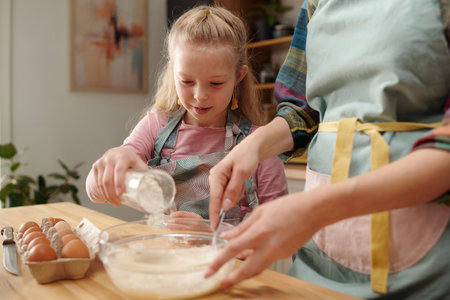 Little child sugar into bowl with shaked raw eggs while helping his mom with dough for homemade pastry by table in the kitchen