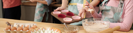 Pastry chef asian mom and son making bakery bread cake prepare delicious sweet food in the kitchen room for dinner at home together happy family lifestyle, Web Banner header.