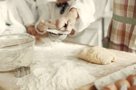 Family cook the dough for cookies