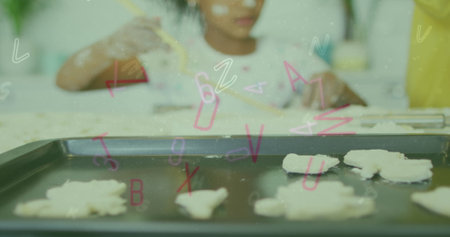 Image of letters and numbers falling over african american girl making cookies. Global education, learning and data processing concept digitally generated image.