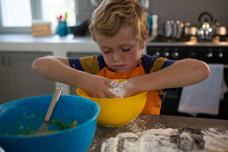 Boy mixing dough in yellow bowl at kitchen counter