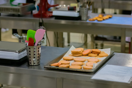 Cookies on baking sheet on kitchen table at cuisine of bakery, restaurant. Professional cooking, bakery, gastronomy, pastry and food concept