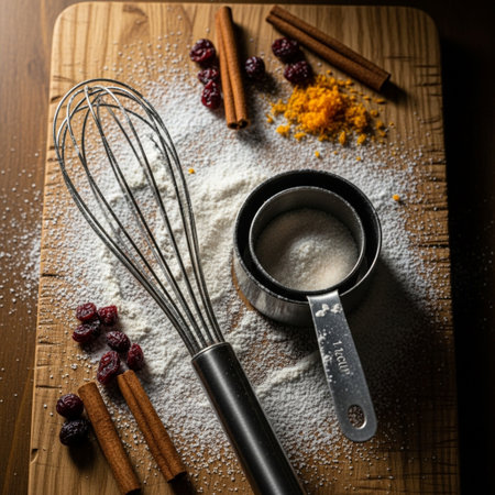 kitchen with variety of baking tools and equipment visible, including mixers, scales, bowls, and measuring cups, created with generative ai