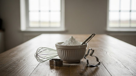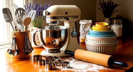 a baking scene with a stand mixer, bowls, and tools on a wooden countertop, ready for home cooking fun.