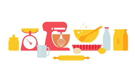 Kitchen tools, kitchenware - cups, bowls, rolling pin, scales, jar, mixer and others. Set of products for baking - flour, milk, eggs, dough. Modern illustration pastel colors.