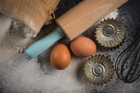 Top View Baking Preparation on wooden Table,Baking ingredients. Bowl, eggs and flour, rolling pin and eggshells on wooden board,Baking concept