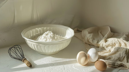 Neatly arranged flour, eggs, and baking tools in a top-down flat lay, emphasizing minimal styling and clean composition for modern food photography and recipe inspiration.
