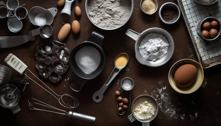 Flatlay collection of tools and ingredients for home baking on a dark wooden table shot from above