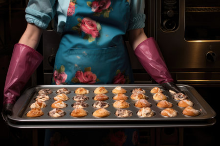 I hope these come out perfect. a woman taking a baking tray out of the oven.
