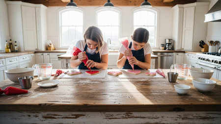 A father and his two young daughters enjoy a heartwarming baking session in a bright, sunlit kitchen. They are making homemade cookies, surrounded by ingredients and colorful cookie cutters, celebrati