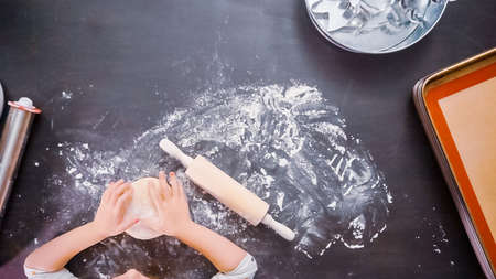 Flat lay. Little girl baking sugar skull cookies for Dia de los Muertos holiday.