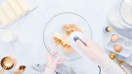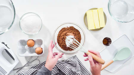 Step by step. Flat lay. Mixing ingredients in a glass mixing bowl to bake chocolate cookies.