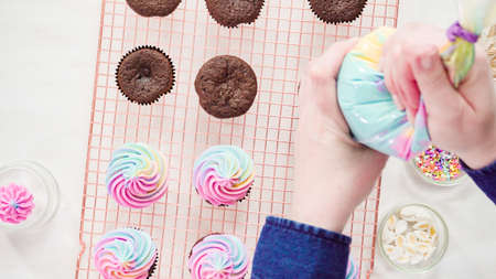 Flat lay. Step by step. Frosting unicorn chocolate cupcakes with rainbow color buttercream frosting.