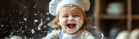 A joyful toddler in a chef hat covered in flour, celebrating a baking mess