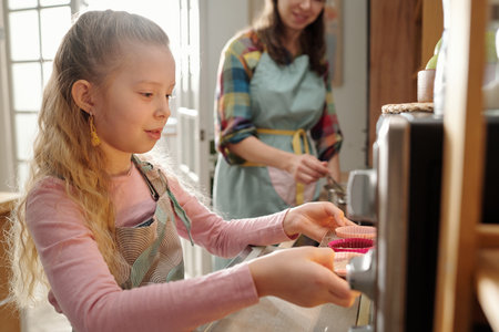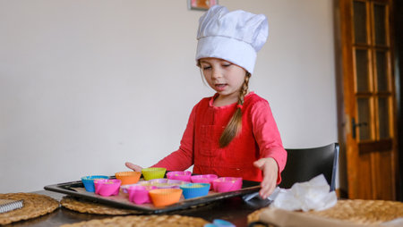 Young girl helping adult bake in home kitchen with window sunlight streaming in while both wear aprons. Child focused on activity, adding cupcake liners