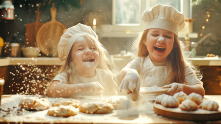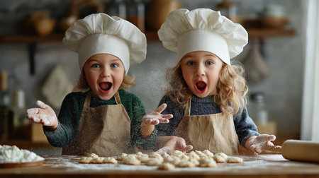 Two excited kids wearing chef hats playing with flour and dough in cozy kitchen childhood cooking fun and family activity image for education and advertising