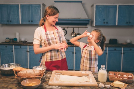 Cute little girl and her beautiful mother are preparing cookies in the kitchen.
