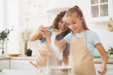 Caucasian mother with apron cheer her daughter to process of cake cooking by sift the flour and enjoy together in home kitchen with happiness and funny.