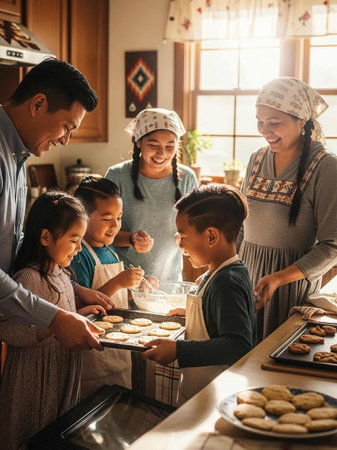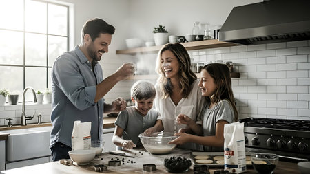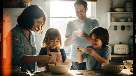 Parents and children share joyful moments while baking in a warm kitchen playfully tossing flour and shaping cookies together on a red checkered cloth.