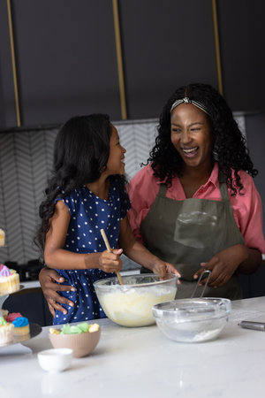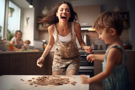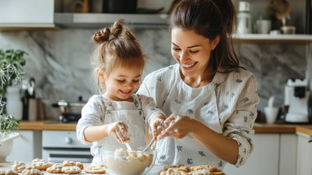 Mother and daughter baking together in kitchen, sharing joyful laughter. Family, bonding, cooking, homemade, parenting, happiness