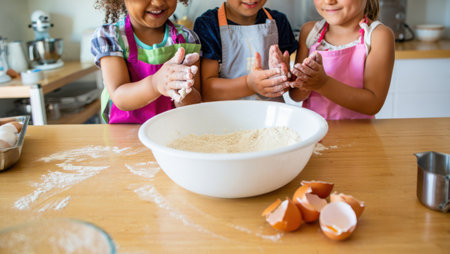 Three children wearing colorful aprons are joyfully participating in baking. They are playing with flour, smiling, and preparing ingredients in a warm, inviting kitchen