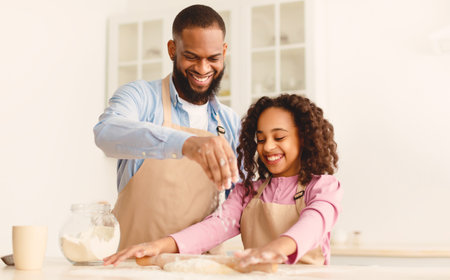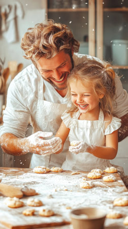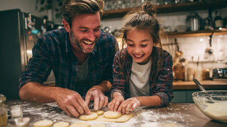 A dad and his daughter joyfully laugh together as they bake cookies in their cozy kitchen. Flour is dusted over their hands highlighting the fun and playful atmosphere of the moment.