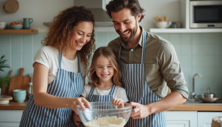 A happy family of three, including a woman, a man, and a young girl, joyfully mix ingredients in a bowl while wearing matching aprons. The warm atmosphere of the kitchen, filled with natural light, highlights their smiles and the love shared in this delightful baking moment.