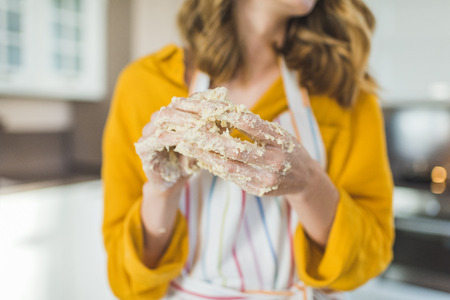Mother and teen daughter making dough for pastry toghether in kitchen